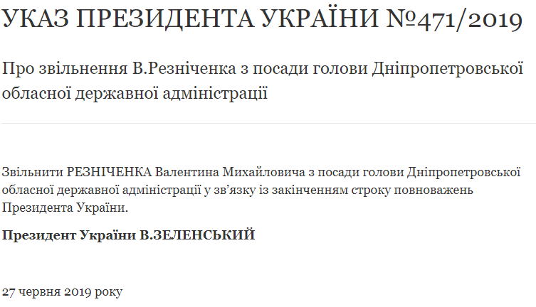 Глава Украины Владимир Зеленский уволил с должности Владимира Резниченко от должности главы Днепропетровской областной государственной администрации (ОГА) и назначил временно исполняющим обязанности главы Днепропетровской областной государственной администрации Дмитрия Батуру.