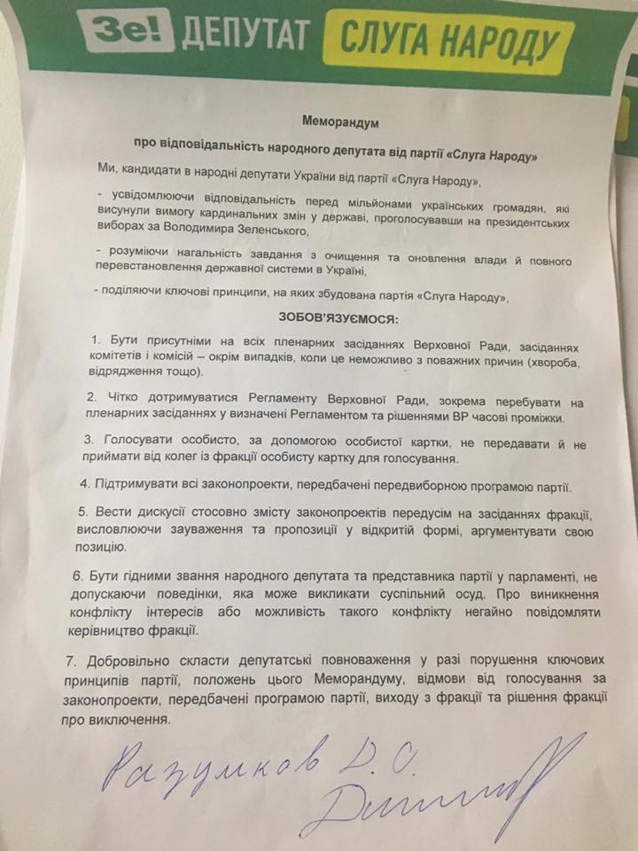 Согласно документу, кандидаты в народные депутаты Украины от партии "Слуга Народа", "осознавая ответственность перед миллионами украинских граждан, которые выдвинули требование кардинальных изменений в государстве, проголосовав на президентских выборах за Владимира Зеленского, понимая срочность задания по очистке и обновлению власти и полной переустановки государственной системы в Украине", обязуются выполнять ряд обязательств.
