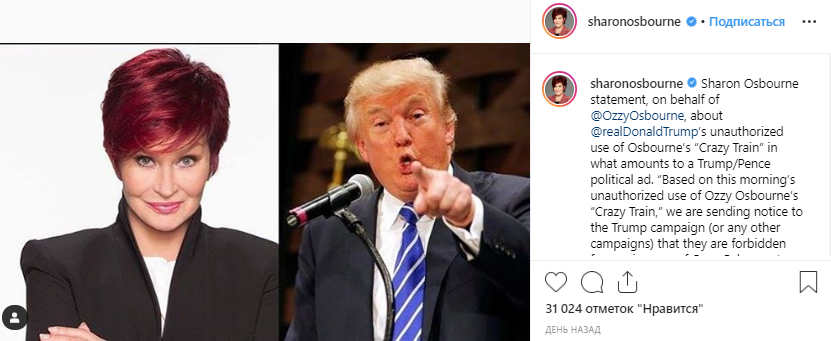 "Основываясь на несанкционированном использовании песни Оззи Осборна "Crazy Train", мы уведомляем кампанию Трампа (или любую другую кампанию), что им запрещено использовать музыку Оззи Осборна в политической рекламе или политических кампаниях. Музыка Оззи не может быть использована без одобрения", - сообщается в заявлении.