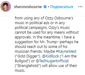 Осборн также предложил Трампу "обратиться к его друзьям-музыкантам". "Может Канье Уэст, Кид Рок или Тэд Ньюджент разрешат использовать их музыку", - отмечается в заявлении.