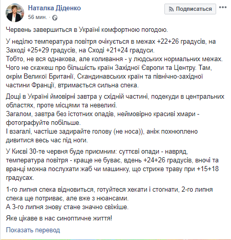 В воскресенье, 30 июня, в Украине будет комфортная погода: +22...+26 градусов. Об этом написала на своей странице в Facebook синоптик Наталья Диденко.