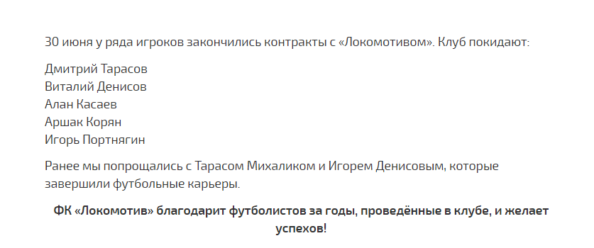 Между тем официальный сайт "Локомотива" сообщил, что 30 июня у клуба подошли соглашения еще с несколькими игроками. Кроме Михалика клуб покидают Дмитрий Тарасов, Виталий Денисов, Алан Касаев, Аршак Корян, Игорь Портнягин