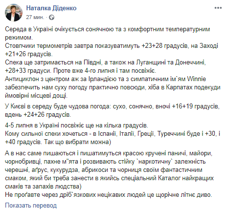 По ее словам, в Киеве в среду будет прекрасная погода: сухо, солнечно, ночью +16...+19 градусов, днем ​​+24...+26 градусов. Также Наталья Диденко сообщила, что 4-5 июля в Украине посвежеет еще на несколько градусов.