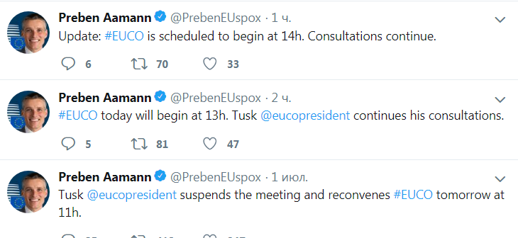 "Саммит планируется начать в 14 часов. Консультации продолжаются", - написал представитель Туска.