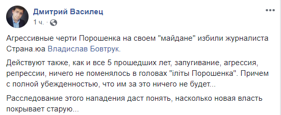 "Агрессивные черти Порошенка на своем "майдане" избили журналиста Страна.юа Владислав Бовтрук. Действуют также, как и все 5 прошедших лет, запугивание, агрессия, репрессии, ничего не поменялось в головах "iлiты Порошенка". Причем с полной убежденностью, что им за это ничего не будет... Расследование этого нападения даст понять, насколько новая власть покрывает старую...", пишет в Facebook журналист Дмитрий Василец.