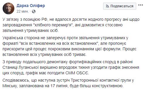 "Надеемся, что следующая встреча трехсторонней контактной группы в Минске, запланированная на 17 июля, будет более конструктивной", - сказано в сообщении.