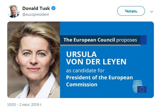 По его словам, претенденткой на пост главы Европейской комиссии является представительница Германии Урсула фон дер Ляйен, которую называют близкой соратницей канцлера ФРГ Ангелы Меркель. С 2013 года Урсула фон дер Ляйен возглавляла министерство обороны Германии.