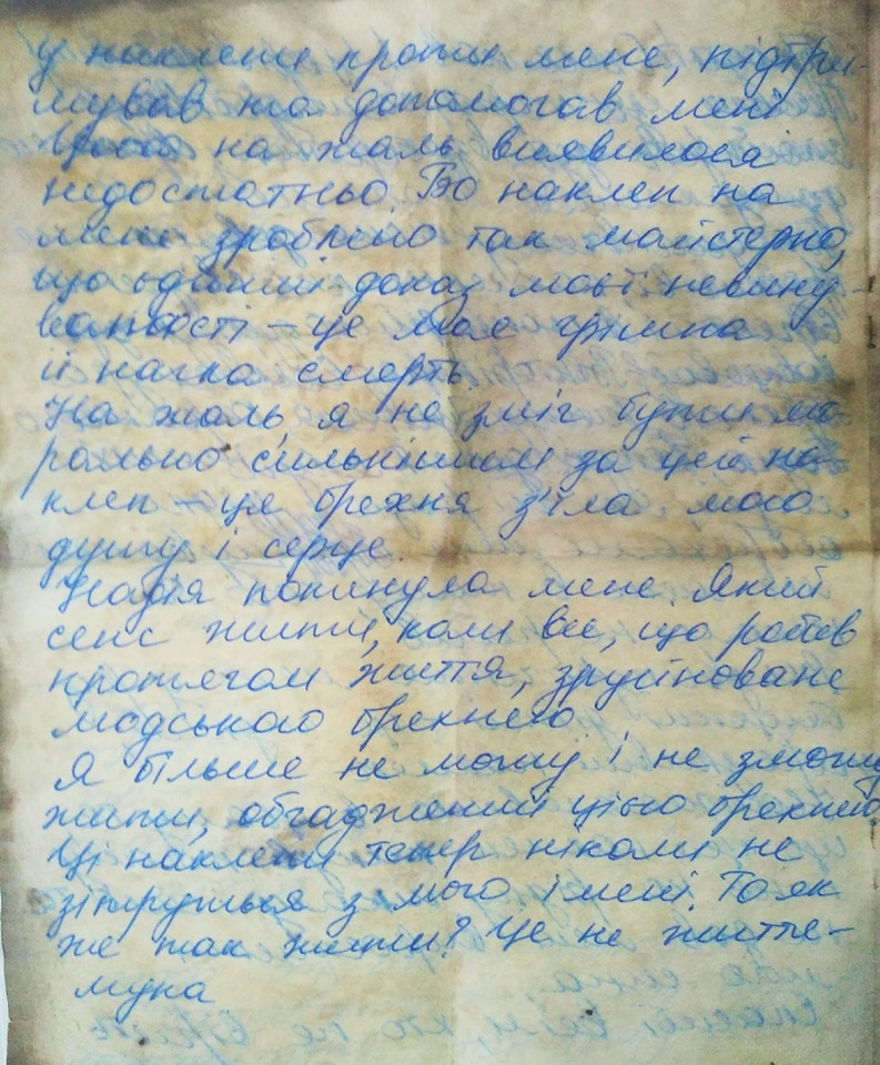 В записке человек просит отпущения греха самоубийства. По всей вероятности, далее (зачеркнуто в тексте) перечисляются имена подозреваемых в преступлении. "... все вместе подло оболгали меня и обвинили меня в том, чего я никогда не делал. Все обвинения меня в совращении детей - это гадкий обидная клевета...", - говорится в предсмертной записке.