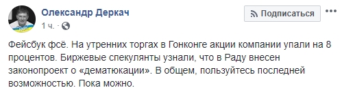 Украинский бизнесмен Александр Деркач шутит: "Фейсбук фсё. На утренних торгах в Гонконге акции компании упали на 8 процентов. Биржевые спекулянты узнали, что в Раду внесен законопроект о "дематюкации". В общем, пользуйтесь последней возможностью. Пока можно".