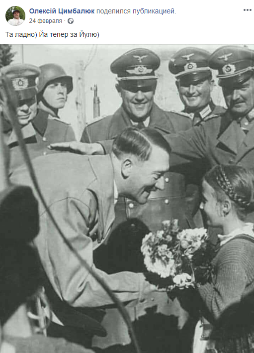 В одном из постов он поделился фотографией Гитлера, который дарит цветы девочке с характерной косой на голове. "Да ладно! Я теперь за Юлю", – прокомментировал он этот снимок.