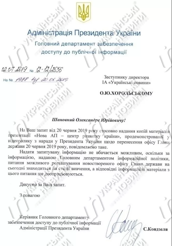 "Предоставить запрашиваемую информацию не представляется возможным, поскольку по информации, предоставленной главным департаментом информационной политики, вопрос возможного расположения вновь созданного офиса Главы государства на сегодня находится на стадии изучения, а соответствующие информационные материалы по этому вопросу еще дорабатываются", - говорится в ответе Администрации Зеленского.