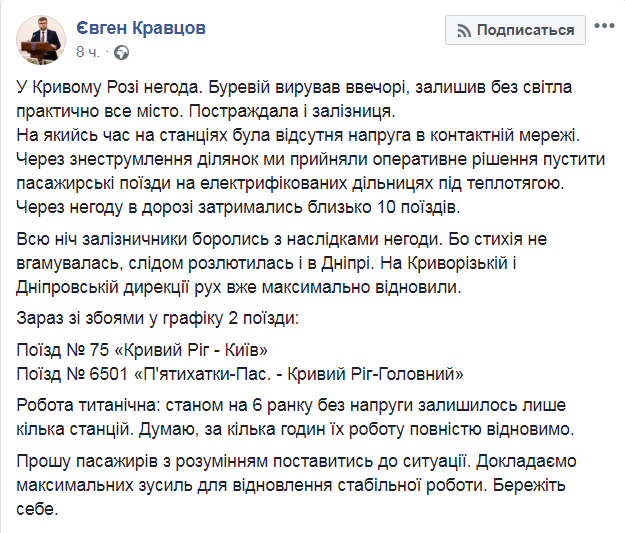 Как рассказал Кравцов, ураган, пронесшийся вечером 2 июля, оставил без света практически весь Кривой Рог. Из-за него пострадала и железная дорога. Некоторое время на станциях отсутствовало напряжение в контактной сети, в пути задержалось около 10 поездов. Поэтому руководство "Укрзализныци" приняло решение пустить пассажирские поезда на тепловой тяге.