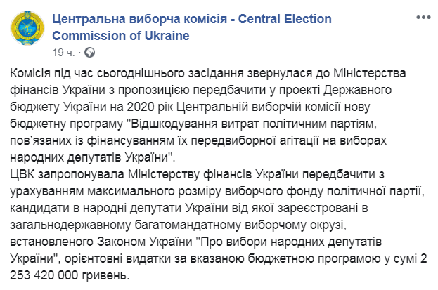 "ЦИК предложила Министерству финансов Украины предусмотреть с учетом максимального размера избирательного фонда политической партии, кандидаты в народные депутаты Украины от которой зарегистрированы в общегосударственном многомандатном избирательном округе, установленного Законом Украины "О выборах народных депутатов Украины", ориентировочные расходы по указанной бюджетной программе в сумме 2 253 420 000 гривен", - сказано в сообщении ЦИК на Facebook.