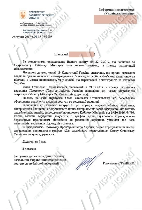 "По информации протокола премьер-министра Украины, за время пребывания в должности обработка документов с грифом "для служебного пользования" Ежову Станиславу Станиславовичу не поручалась", - сказано в сообщении.