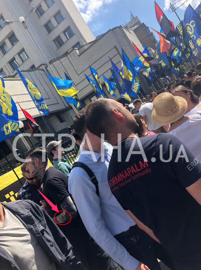 Сегодня, 4 июля, в Киеве на пикете сторонников экс-президента Петра Порошенко и радикалов у здания Конституционного суда был замечен участник митинга с татуировкой свастики на руке.