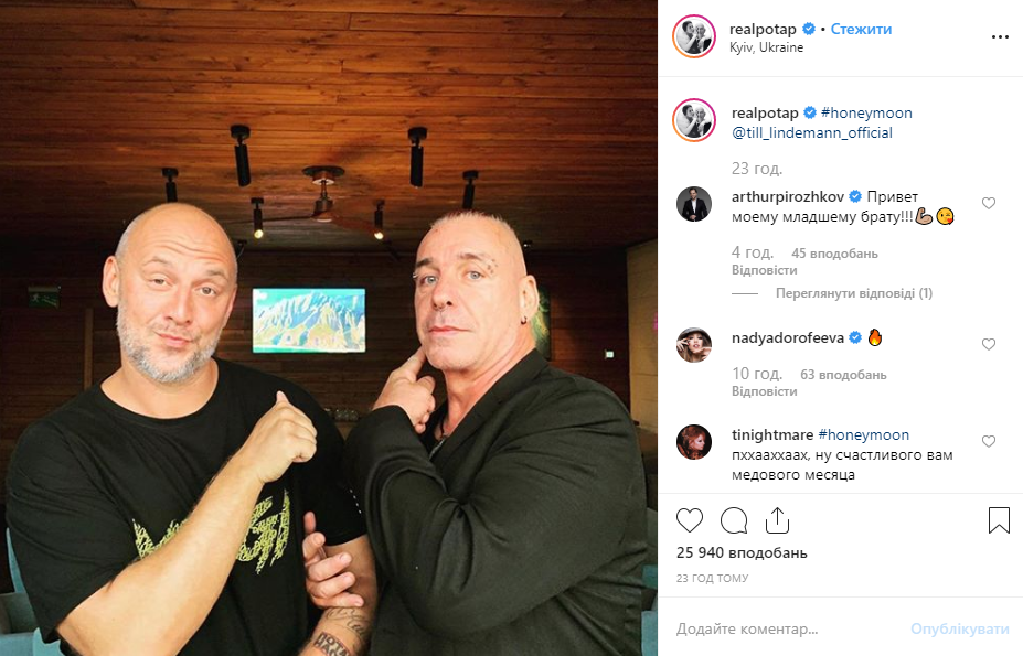 Любопытно, что Потап под совместным фото с Тиллем разместил хэштег #honeymoon или "медовый месяц". Его подписчики сразу же оценили юмор кумира.