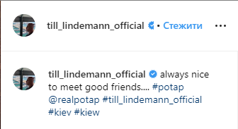 При этом автор поста не сделал подписи к фото, а лишь тегнул Тилля. Рок-музыкант отреагировал на публикацию и на своей странице написал под фото, что это встреча со старым другом. Причем, она состоялась в Киеве.