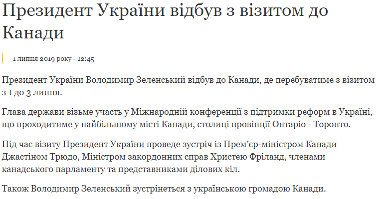 Пресс-служба президента Украины Владимира Зеленского перепутала столицу Канады, куда глава страны отправился с визитом, указав вместо Оттавы Торонто.