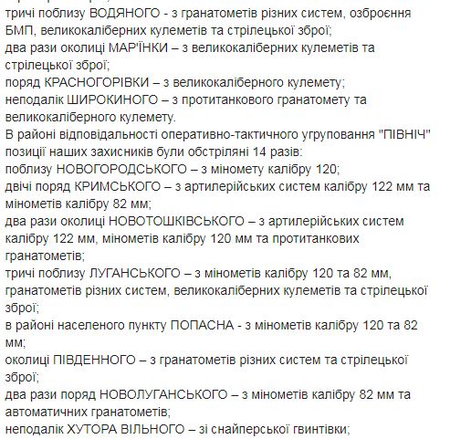 "С начала текущих суток враг 6 раз обстрелял позиции Объединенных сил. В районе ответственности оперативно-тактической группировки "Восток" враг совершил четыре обстрела позиций украинских защитников: возле Водяного, Новотроицкого, в районе Николаевки и окрестности Богдановки. В районе ответственности оперативно-тактической группировки "Север" украинские позиции были обстреляны два раза: возле Крымского и Новотошковского", - говорится в отчете.