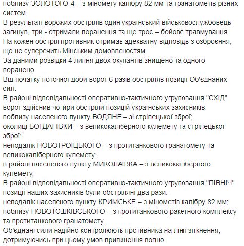 В районе ответственности оперативно-тактической группировки "Север" украинские позиции были обстреляны 14 раз: возле Новгородского, Крымского, Луганского, Новолуганского, Хутора Вольный, Золотого-4, окрестности Новотошковского, Южного, в районе Попасной. По данным разведки, 4 июля двух боевиков убили, один ранен.