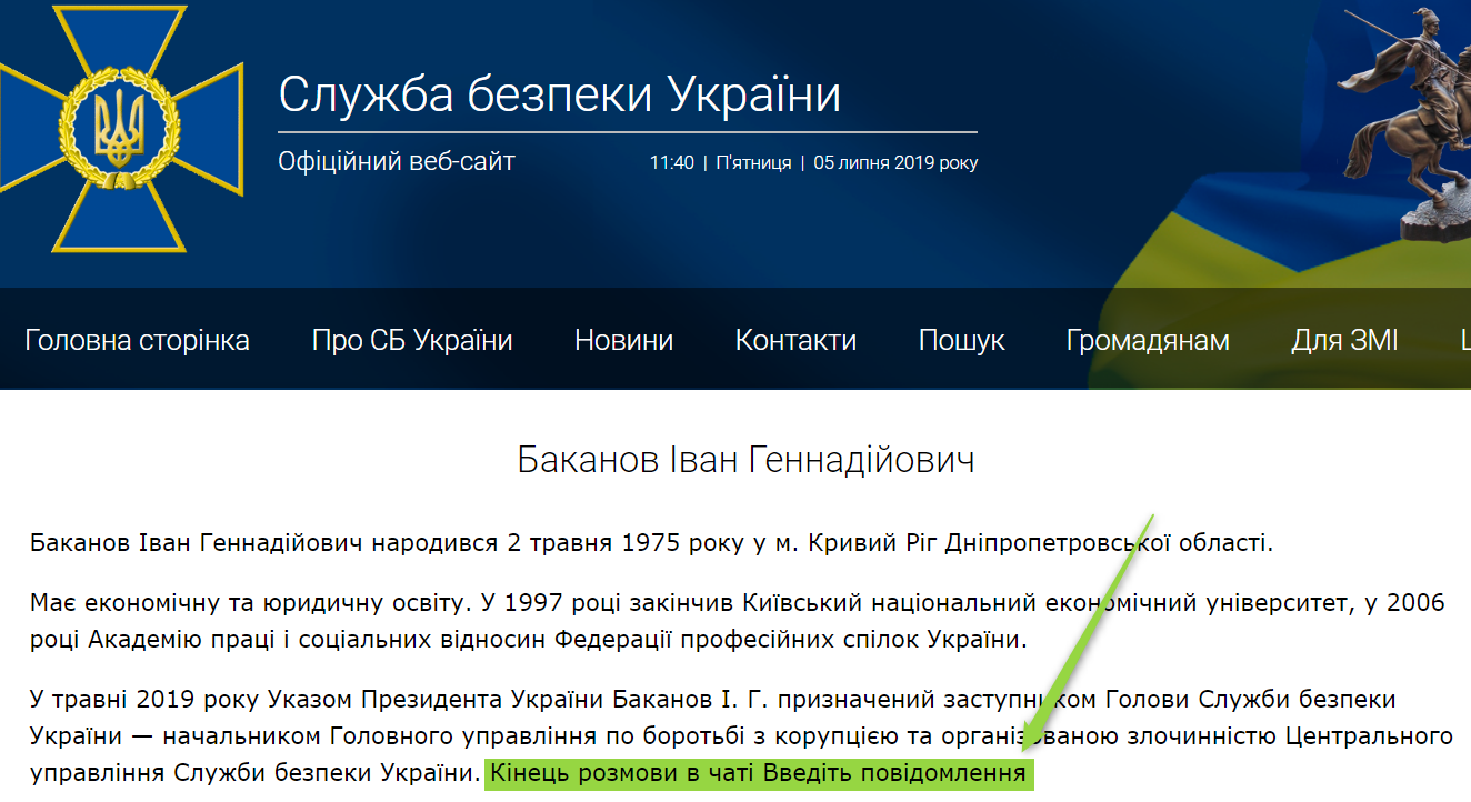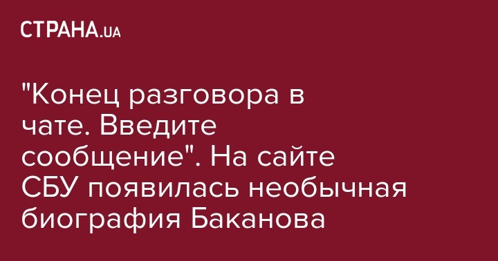 "Кінець розмови в чаті Введіть повідомлення", - указывается в конце абзаца, где говорится о том, что в мае Баканов стал первым замглавы СБУ.