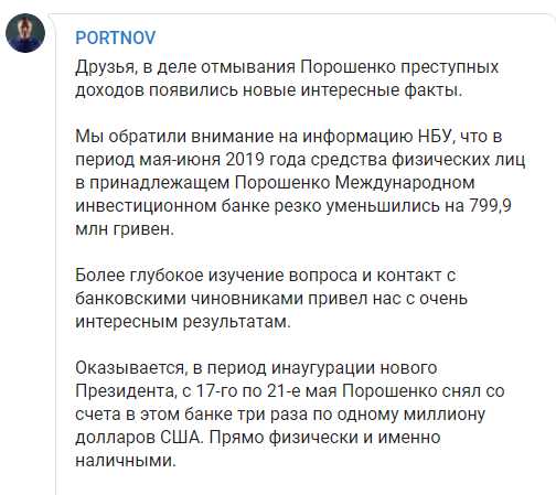 "Мы обратили внимание на информацию НБУ, что в период мая-июня 2019 года средства физических лиц в принадлежащем Порошенко Международном инвестиционном банке резко уменьшились на 799,9 млн гривен. Более глубокое изучение вопроса и контакт с банковскими чиновниками привел нас с очень интересным результатам.