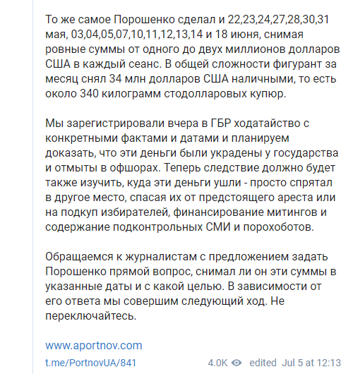 Оказывается, в период инаугурации нового президента, с 17-го по 21-е мая Порошенко снял со счета в этом банке три раза по одному миллиону долларов США. Прямо физически и именно наличными. То же самое Порошенко сделал и 22,23,24,27,28,30,31 мая, 03,04,05,07,10,11,12,13,14 и 18 июня, снимая ровные суммы от одного до двух миллионов долларов США в каждый сеанс. В общей сложности фигурант за месяц снял 34 млн долларов США наличными, то есть около 340 килограмм стодолларовых купюр", - пишет Андрей Портнов.