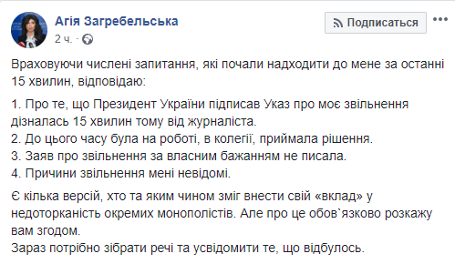 Позже Загребельская написала на своей странице в Facebook, что узнала о своем увольнении от журналистов.