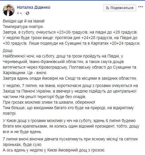 В Киеве дожди с грозами возможны в ночь на субботу. "Днем 6 июля будем бегать между капельками, как когда-то один известный президент, то есть, дождя все же не будет днем. 7 июля ночью веночки девушки будут пускать при ясной луне и светлых звездочки, будет сухо. А вот днем в воскресенье в Киеве вероятный дождь с грозой", - резюмировала Диденко.