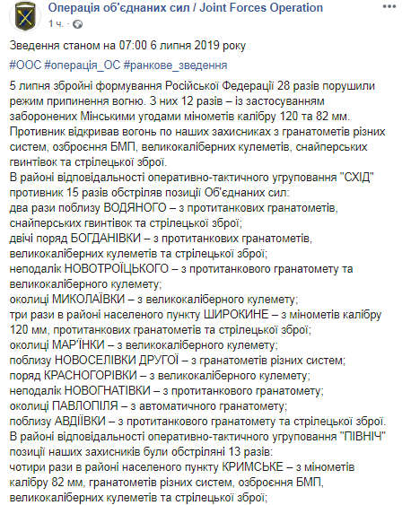 При этом 12 раз было применены запрещенные минскими соглашениями минометы калибра 120 и 82 мм. Также огонь велся из гранатометов различных систем, вооружения БМП, крупнокалиберных пулеметов, снайперских винтовок и стрелкового оружия.