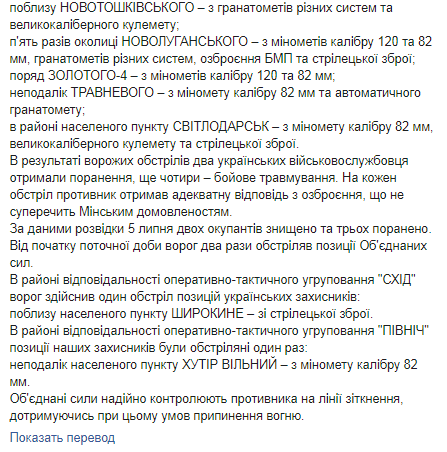 Два украинских военнослужащих получили ранения, еще четыре - боевые травмирования. По данным штаба ООС, на каждый обстрел противник получил адекватный ответ из вооружения, не противоречащего Минским договоренностям. Разведка сообщила, что двое боевиков были уничтожены и трое ранены.