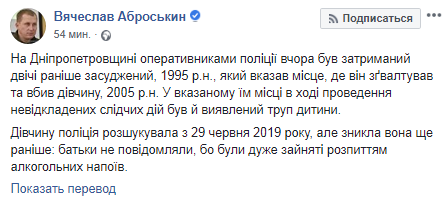 В пятницу, 5 июля, в Днепропетровской области полицейские задержали мужчину, который изнасиловал и убил 14-летнюю девочку. Об этом в Facebook сообщил заместитель главы Нацполиции Вячеслав Аброськин.