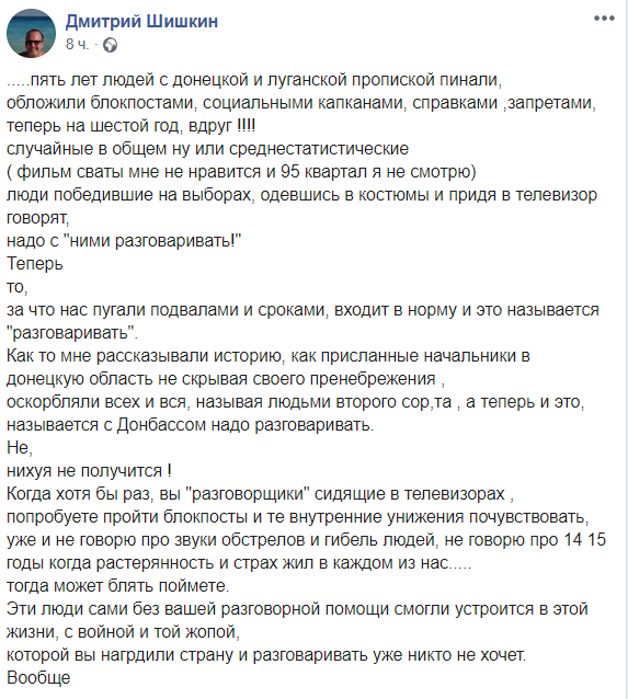 Эти люди сами без вашей разговорной помощи смогли устроится в этой жизни, с войной и той жопой, которой вы нагрдили страну и разговаривать уже никто не хочет. Вообще", - пишет в Facebook донецкий журналист Дмитрий Шишкин, живущий в Киеве.