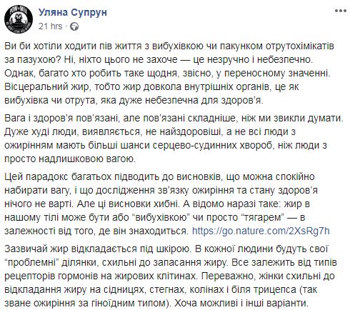 "Хорошие новости заключаются в том, что образ жизни значительно больше влияет на жировые отложения, чем генетика. Надо твердо решить, что не хотите именно в этом походить на отца-мать, не следовать их традиции питания, и следить образ жизни и рацион с юности", - написала Супрун.
