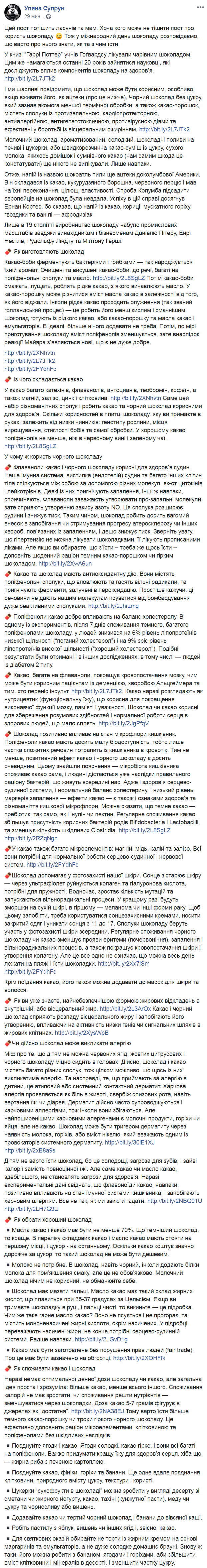 По случаю Европейского дня шоколада и.о. главы Минздрава Украины Ульяна Супрун решила просветить украинцев по поводу пользы этого продукта. Многобуквенный пост на эту тему чиновница опубликовала на своей странице в Facebook.