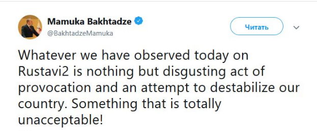 Премьер-министр страны Мамука Бахтадзе также негативно отнесся к сквернословию телеведущего. Он назвал произошедшее "отвратительным актом провокации" и "попыткой дестабилизировать Грузию".