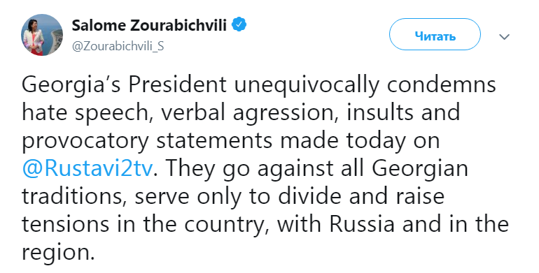 "Президент Грузии однозначно осуждает разжигание ненависти, словесную агрессию, оскорбления и провокационные заявления, сделанные сегодня на "Рустави-2". Они идут вразрез со всеми грузинскими традициями, служат только для разделения с Россией и повышения напряженности в стране и в регионе", - написала президент.