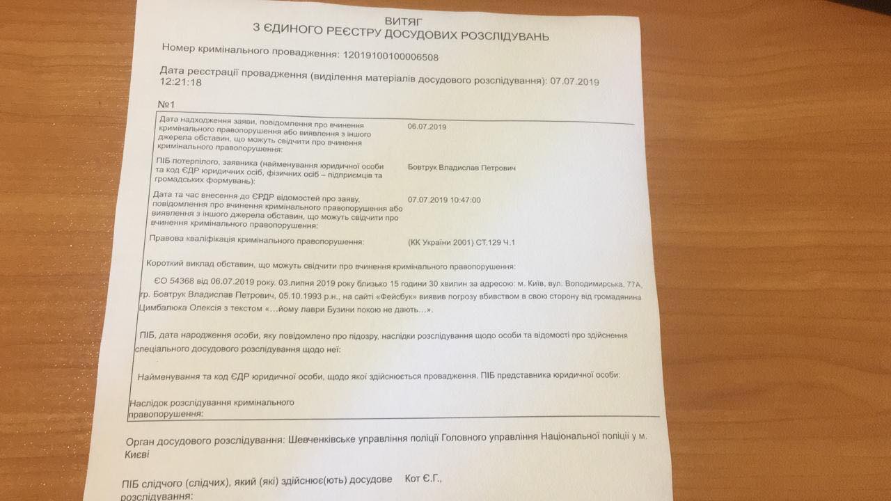 Речь идет об угрозе убийства. После того, как Бовтрук подал заявление в полицию после избиения, Цымбалюк написал в Facebook, что нашему журналисту "не дают покоя лавры Бузины".