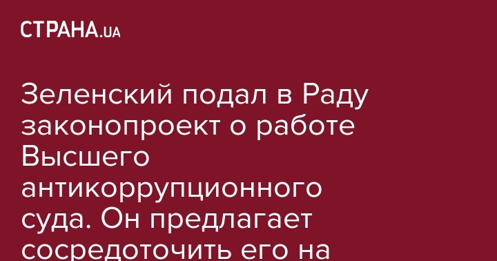 Президент Украины Владимир Зеленский в понедельник, 8 июля, подал в Верховную Раду законопроект №10426 об изменениях в закон о Высшем антикоррупционном суде, в соответствии с ними работа ВАКС будет сосредоточена на топ-коррупции. Об этом сообщает пресс-служба главы государства