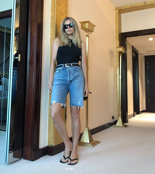На фотографии певица позирует на балконе и в номере парижской гостиницы. Брежнева одета в джинсовые шорты до колена, черную обтягивающую майку, которая подчеркивает фигуру, и черные вьетнамки. Дополняют повседневный летний лук солнцезащитные очки и черный тонкий пояс.