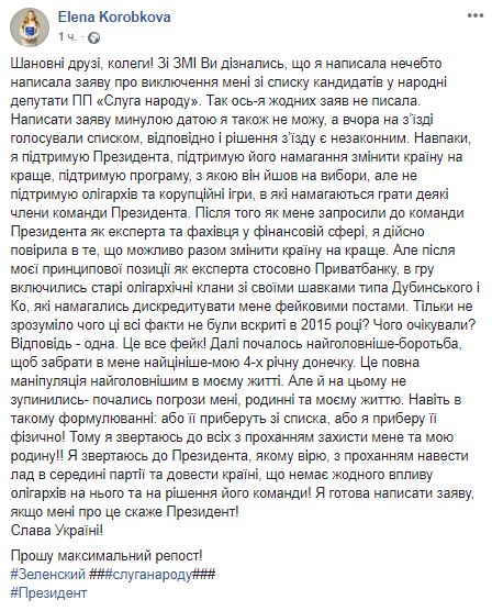 По словам Коробковой, начались угрозы ей и ее семье. "Поэтому я обращаюсь ко всем с просьбой защиты меня и мою семью! Я обращаюсь к президенту, которому верю, с просьбой навести порядок внутри партии и доказать стране, что нет никакого влияния олигархов на него и решения его команды! Я готова написать заявление, если мне об этом скажет президент!" - написала она.