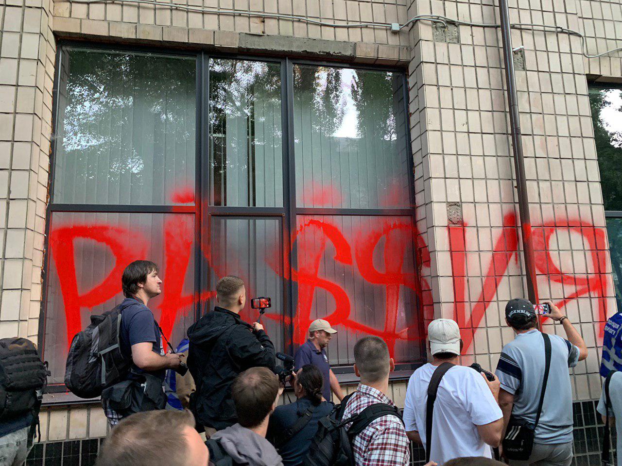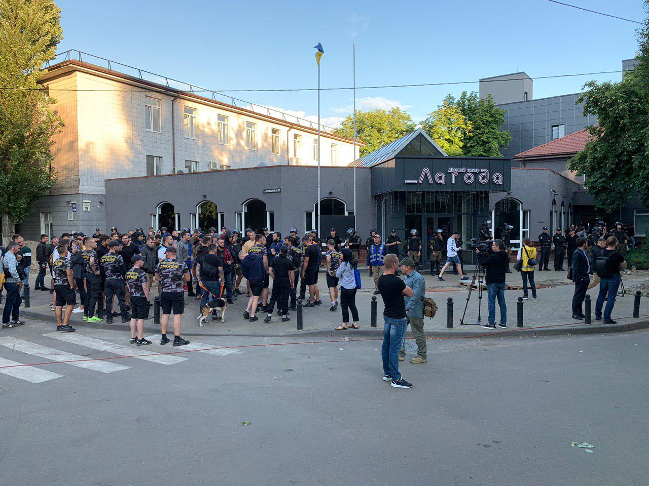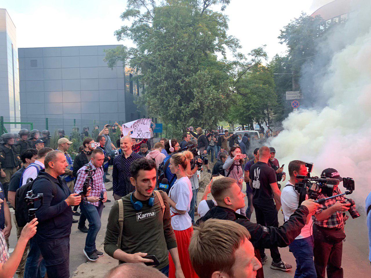 Как сообщает журналист "Страны", у здания канала находятся около трех сотен человек, среди которых члены Нацкорпуса и С14. Националисты жгут фаера, а на территорию комплекса, где расположен телеканал, залетают петарды. На кордоне выстроились бойцы Нацгвардии.