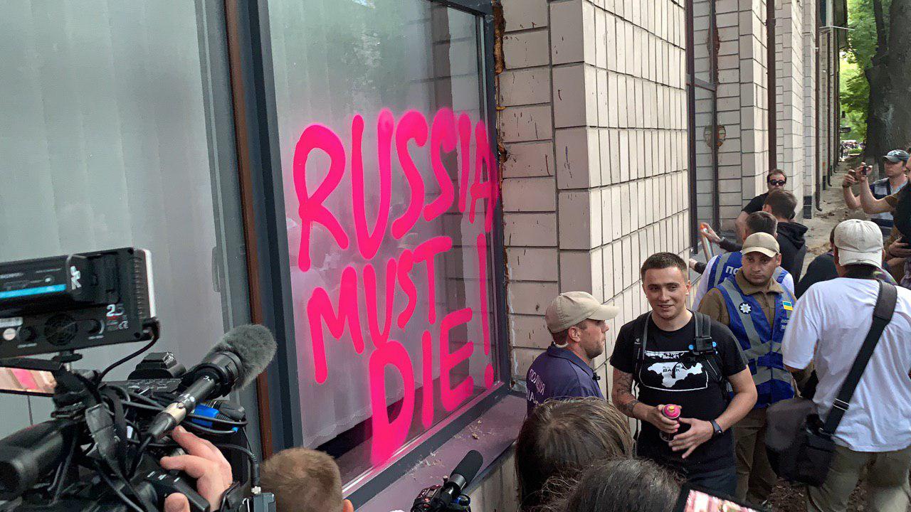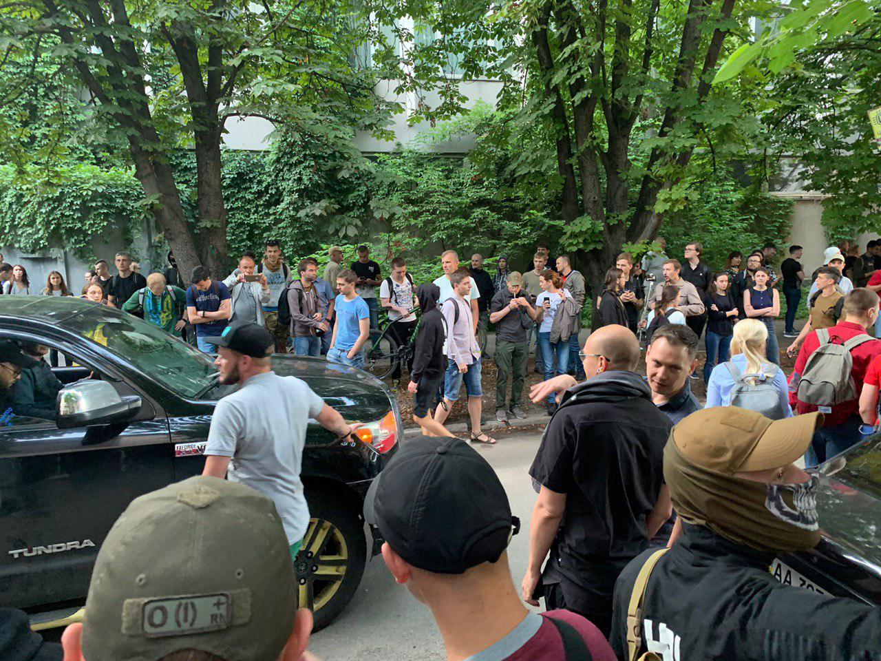 Вечером в понедельник, 8 июля, под зданием телеканала NewsOne в Киеве собрались националисты, которые протестуют против проведения телемоста с российским федеральным каналом "Россия-24", который позже был отменен из-за поступивших в адрес журналистов угроз.