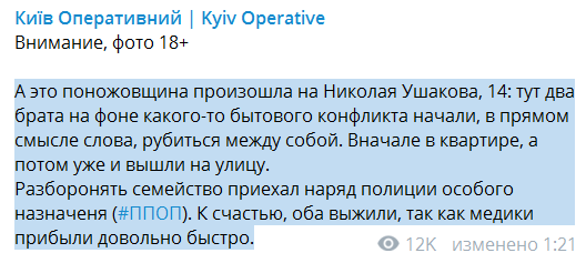 Вчера, 8 июля, в Киеве произошла дикая история, которая едва не закончилась двойной трагедией. Два брата поругались, и чтобы разрешить конфликт схватились за ножи.