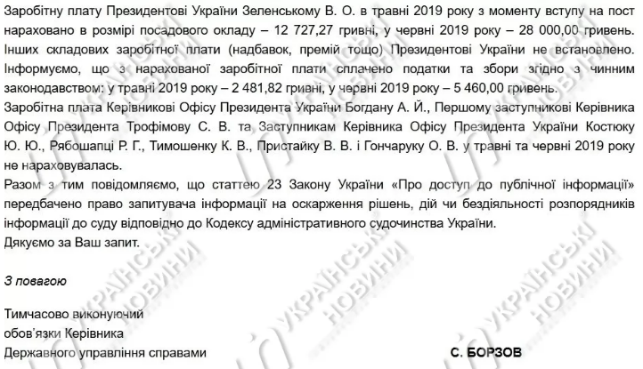 "Заработная плата руководителю Офиса Президента Украины Богдану А. И., Первому заместителю Руководителя Офиса Президента Украины Трофимову С. В. и Заместителям Руководителя Офиса Президента Украины Костюку Ю. Ю., Рябошапке Р. Г., Тимошенко К. В., Пристайко В. В. И Гончаруку А. В. В мае и июне 2019 года не начислялась", - говорится в тексте.