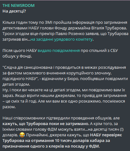 По данным собеседников, обыски в ФГИ действительно проводились, как ранее уже подтверждали в НАБУ. Однако Трубарова пока не задержали. В данный момент НАБУ проверяет его на получение 10 тысяч долларов взятки за назначение одного из клерков на должность в ФГИ.