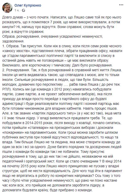 P.S. Чуть не забыл. Фейсбучной партии-фейсбучное заявление. Заявляю о выходе из Радикальной партии Олега Ляшко, идентификационный код 37279703, единственный учредитель Телипко Владислав Єдуардович, м. Николаев, Центральный район, переулок Парусный 9-Б, кв ХХХ. Размер взноса в уставный фонд 0.00 грн", - написал на своей странице в Facebook Олег Куприенко.