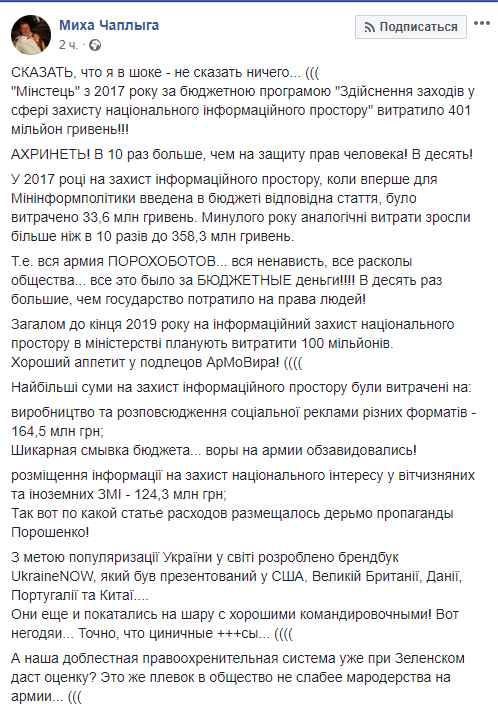 "Сказать, что я в шоке - не сказать ничего..."Мінстець" з 2017 року за бюджетною програмою "Здійснення заходів у сфері захисту національного інформаційного простору" витратило 401 мільйон гривень!!! В 10 раз больше, чем на защиту прав человека! В десять! Они еще и покатались на шару с хорошими командировочными! Вот негодяи... Точно, что циничные +++сы... А наша доблестная правоохренительная система уже при Зеленском даст оценку? Это же плевок в общество не слабее мародерства на армии...", - написал он на своей странице в Facebook во вторник.