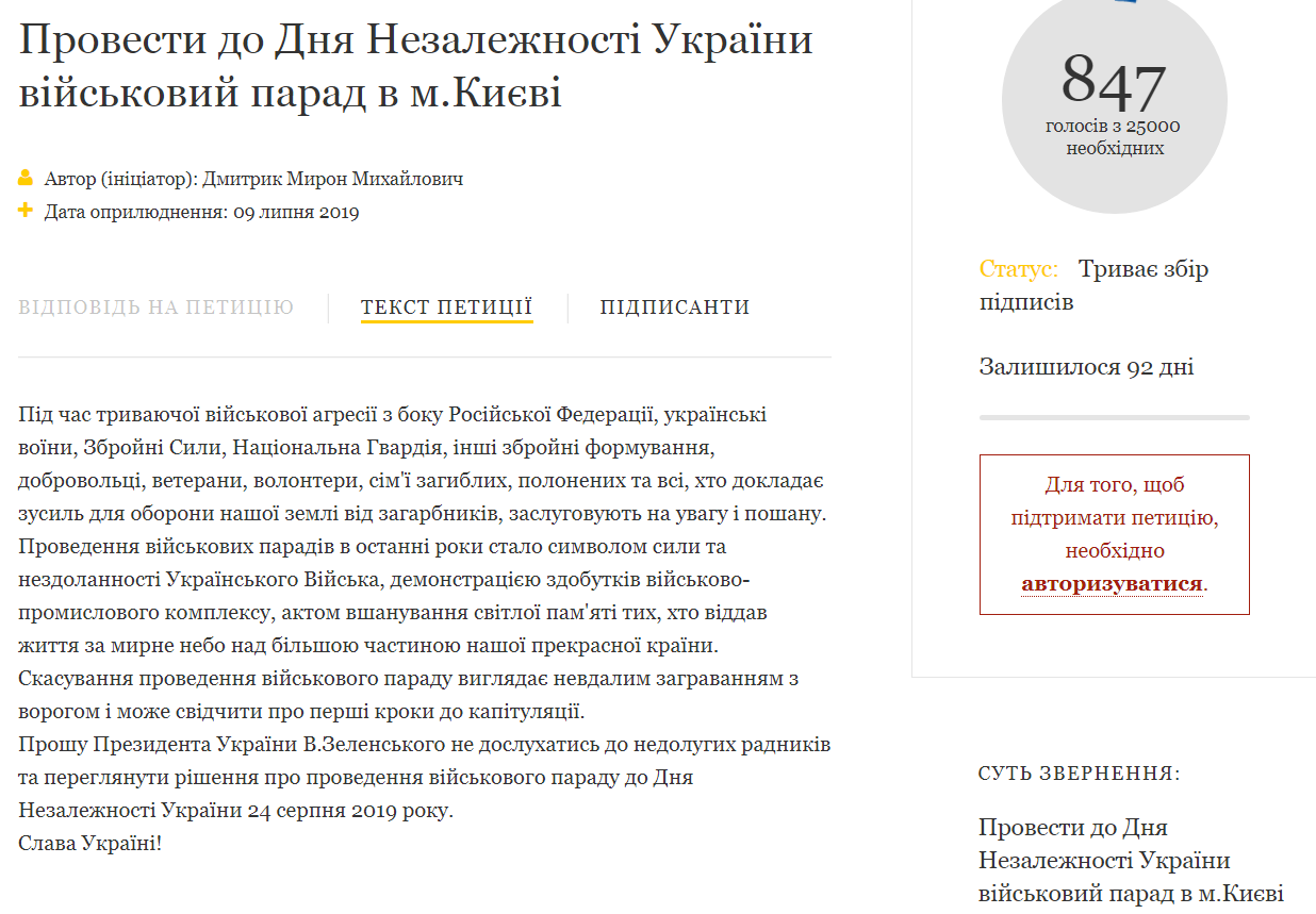 На официальном сайте президента Украины зарегистрирована петиция с требованием к Владимиру Зеленскому провести 24 августа военный парад. Текст документа, инициированного Мироном Дмитриком, появился на сайте главы государства 9 июля.