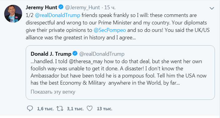 Скандал с послом. Глава Форин-офис Джереми Хант обвинил Трампа во лжи и неуважении к Британии